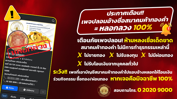ประกาศเตือน!! เพจปลอมอ้างชื่อสมาคมค้าทองคำ = หลอกลวง 100%